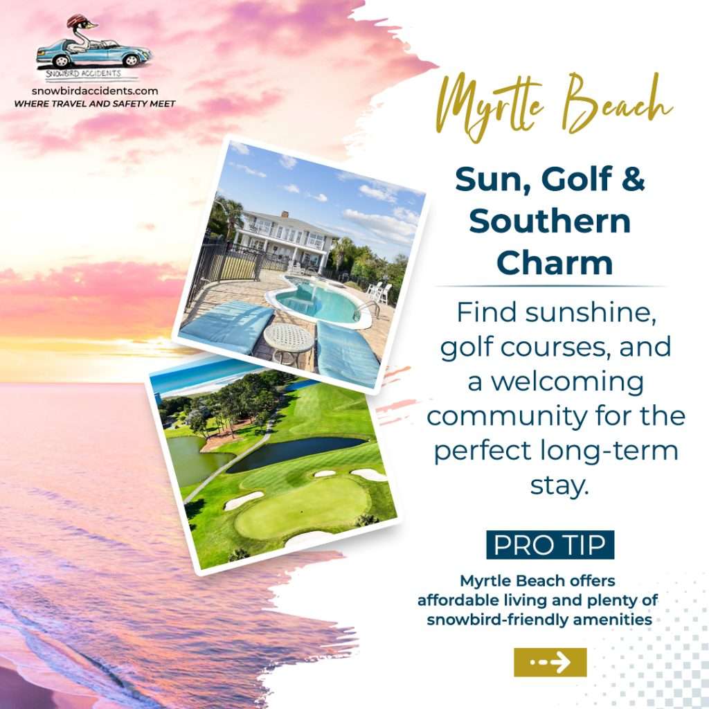 Myrtle Beach is a long-standing favourite among Canadian snowbirds. Its mild winters, beautiful coastlines, and abundance of golf courses attract thousands of snowbirds each year. While slightly cooler than Florida, Myrtle Beach offers plenty of sunshine and a welcoming atmosphere. Affordable living costs and a strong snowbird community also make this destination an appealing choice.