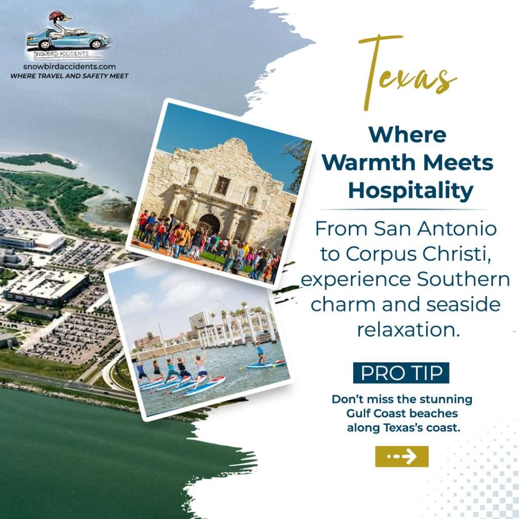 The Lone Star State, with cities like San Antonio and Corpus Christi, offers a perfect balance of warmth and hospitality for snowbirds. Snowbirds from Canada find the mild winter climate ideal, and Texas’s affordable living costs make it a great place for long-term stays. Snowbird travel insurance is a must when driving through such a vast state, especially for Canadians unfamiliar with local regulations.
