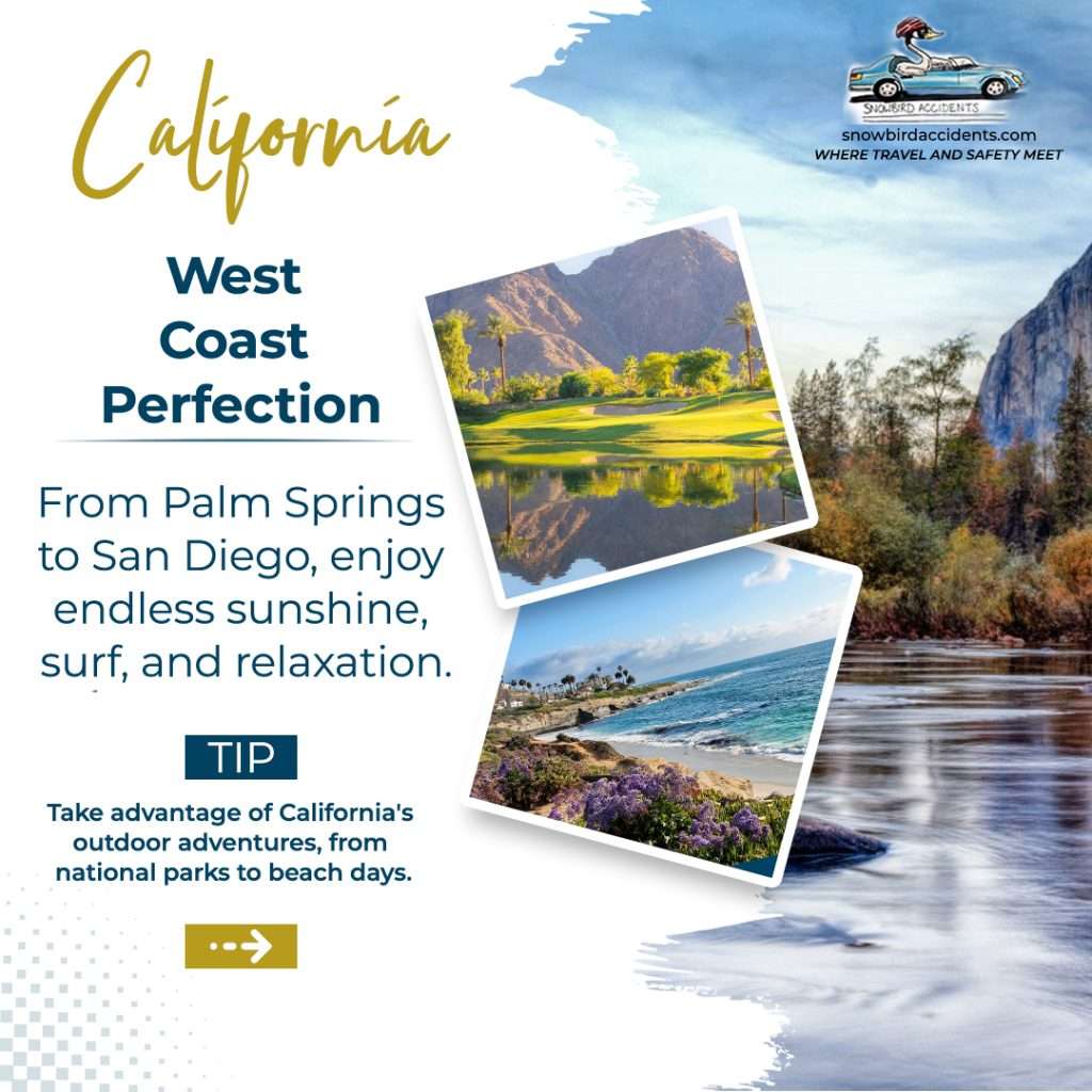 Snowbirds from Canada flock to California to enjoy its warm climate, especially in cities like Palm Springs and San Diego. California’s extensive coastline, cultural richness, and varied landscapes make it an ideal destination for winter travellers. With mild temperatures year-round, Snowbirds from Canada can immerse themselves in the state’s abundant outdoor activities. Plus, for those driving down, many opt for Snowbird insurance to ensure their travels are safe.