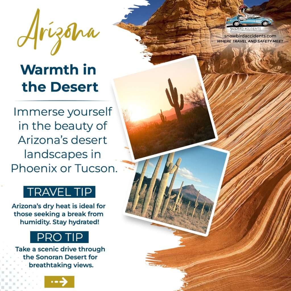 Arizona, particularly cities like Phoenix and Tucson, has emerged as a snowbird hotspot. Snowbirds can enjoy the desert warmth, stunning mountain views, and lower living costs compared to coastal areas. For Canadian travellers, the dry heat offers a welcome contrast to the cold, and cross-border accidents are less of a concern with its extensive road networks and excellent safety standards. Don’t forget to secure your snowbird car insurance when driving across the border.