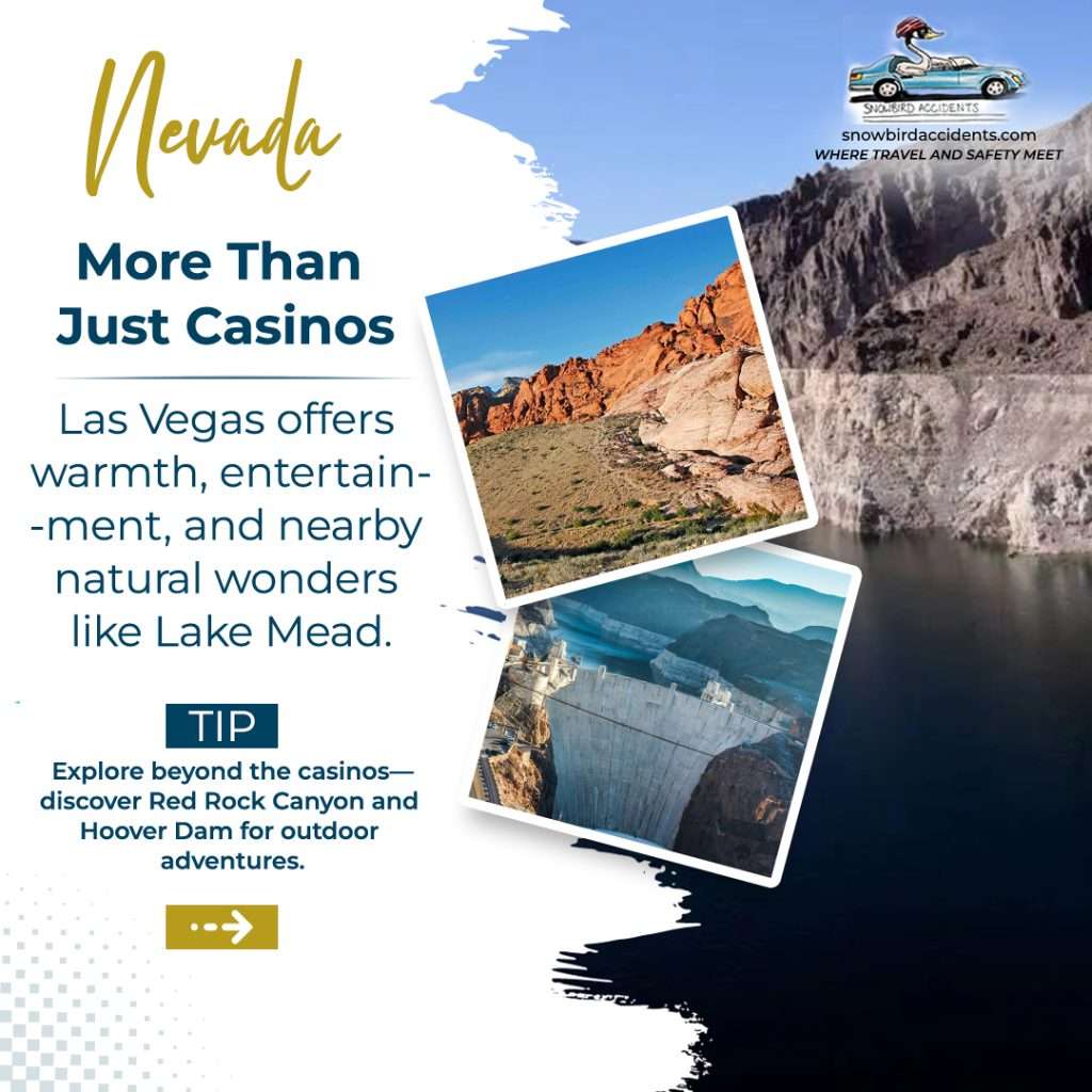 Las Vegas isn’t just for quick vacations; it’s also becoming a favourite among snowbirds. With endless entertainment, affordable housing, and easy access to outdoor activities in nearby areas like Lake Mead and Red Rock Canyon, Nevada has become a great alternative to traditional snowbird spots. Many snowbirds from Canada find Las Vegas’s winter warmth and amenities perfect for long-term escapes.